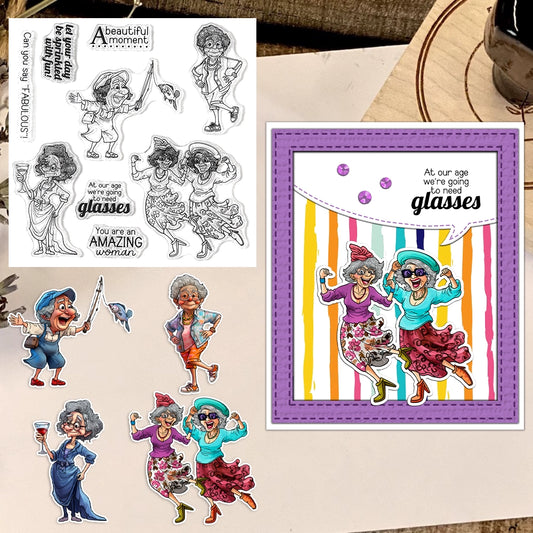 Happy Old Lady Fishing and Dancing Clear Stamps